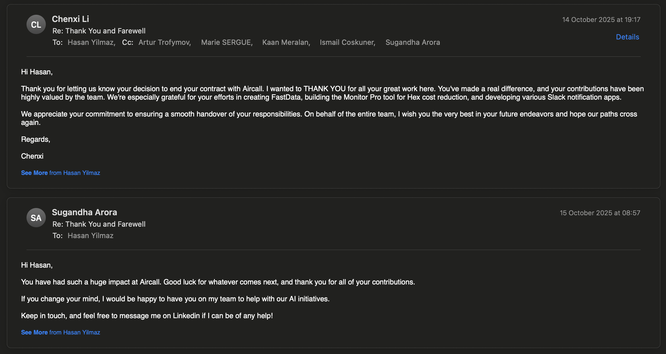 I wanted to THANK YOU for all your great work here. You've made a real difference, and your contributions have been highly valued by the team. We're especially grateful for your efforts in creating FastData, building the Monitor Pro tool for Hex cost reduction, and developing various Slack notification apps. We appreciate your commitment to ensuring a smooth handover of your responsibilities. On behalf of the entire team, I wish you the very best in your future endeavors and hope our paths cross again. Regards,